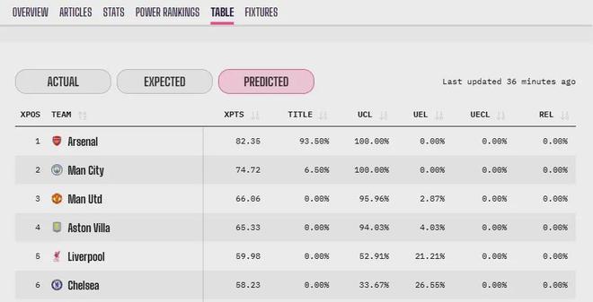 输掉这场比赛后,阿森纳多赛两场领先曼城9分。Opta的夺冠概率预测从97%降到了93.5%——仍然高得惊人,却也脆弱得让人心惊。
